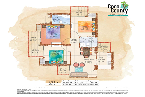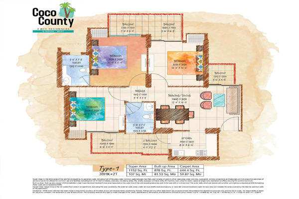 Coco County offers only 3 BHK apartments with a super area of approximately 1152 sq. ft., designed for families looking for spacious and affordable living.