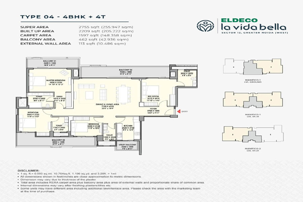 The 3.7-acre Eldeco La Vida Bella complex has 335 well-designed apartments spread across five graceful, 22-story towers. Premium apartments with 2, 3, and 4 bedrooms are available in this project; they are expertly designed to accommodate a range of family needs.