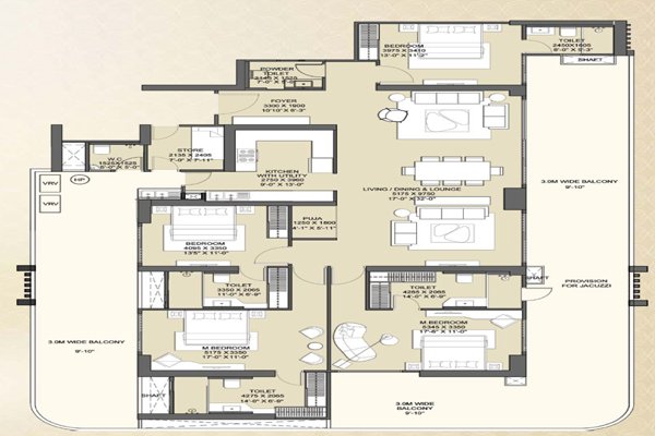 FOYER + LIVING/DINING & LOUNGE + 4 BEDROOMS + PUJA + KITCHEN WITH UTILITY + 4 TOILETS + 1 POWDER TOILET + 2 BIG BALCONIES + STORE + WC