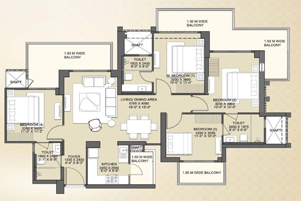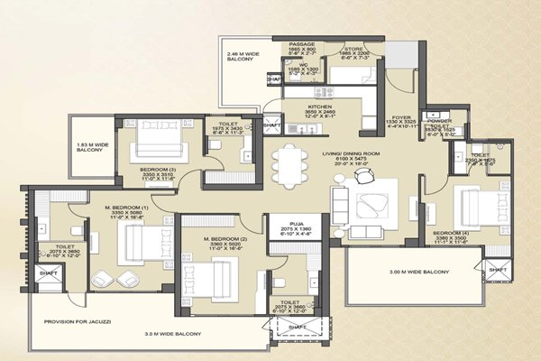 FOYER + LIVING & DINING + 4 BEDROOMS + PUJA + KITCHEN WITH UTILITY BALCONY + 4 TOILETS + 2 BIG BALCONIES + 1 BALCONY