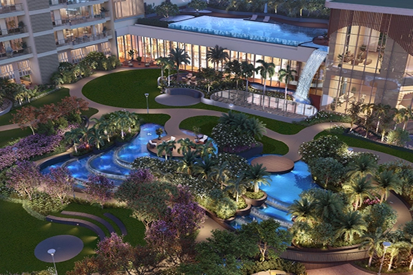 It offers a 40,000+ sq. ft luxury clubhouse, infinity pool, spa & wellness center, sports facilities, landscaped gardens, jogging tracks, banquet hall, and 24x7 security.