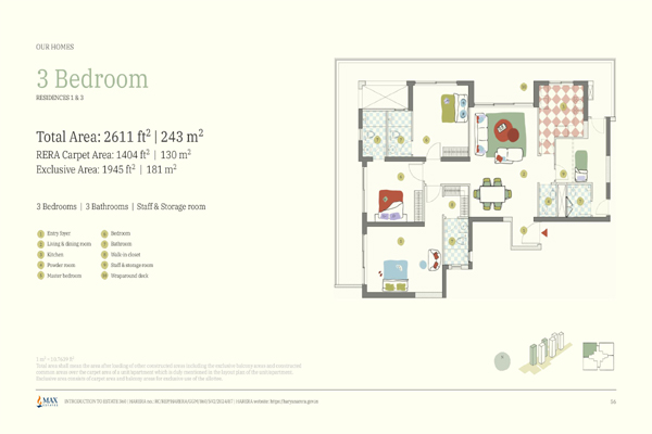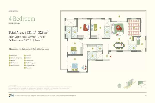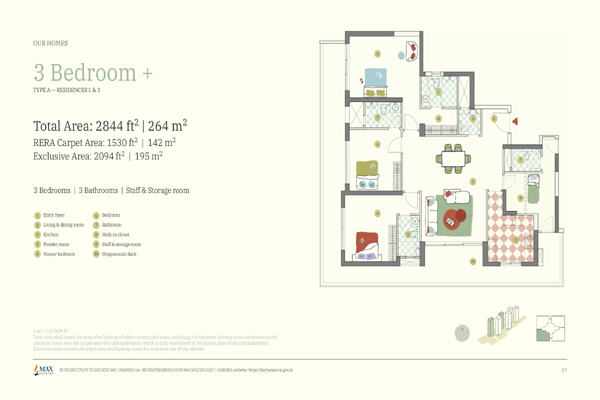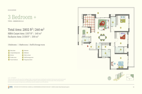 Max Estate 360 offers spacious 3 BHK and 4 BHK luxury apartments, with options that include a staff room, wraparound balconies, and en-suite bathrooms in every bedroom.