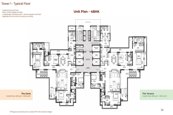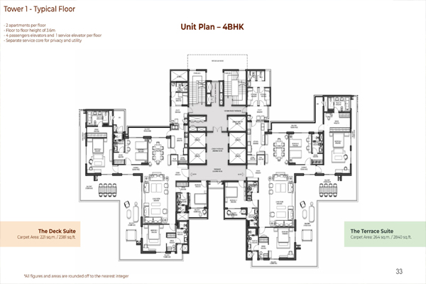 Tower 1 - Typical Floor - 2 apartments per floor - Floor to floor height of 3.6m - 4 passengers elevators and 1 service elevator per floor - Separate service core for privacy and uti
