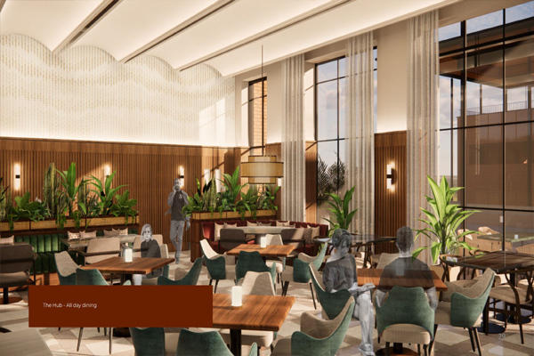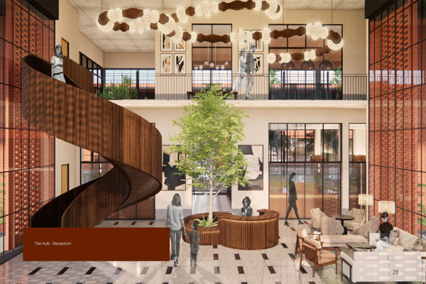 - Double-height lobbies with natural light
