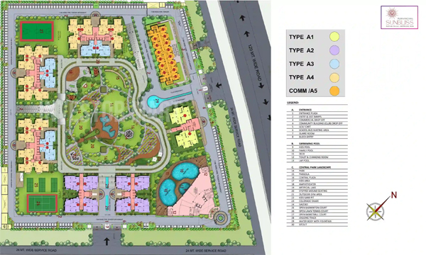 Purvanchal Sunbliss comprises 7 towers, each with around 25 floors, and about 646 apartments in total.