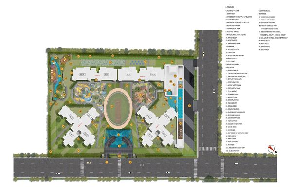 While specific eco elements like rainwater harvesting or solar systems aren't detailed explicitly, the layout emphasizes greenery, water bodies, and landscaped parks as part of responsible urban planning.